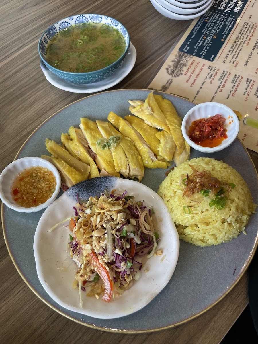 Rice based dishes offer a different kind of comfort. Broken Rice with Chicken and Fried Egg is filling and familiar, with grilled or seasoned chicken served over fractured rice grains that absorb sauces beautifully. Another favorite is Cơm Gà Hội An, a dish inspired by central Vietnamese cuisine that emphasizes fragrant rice and gently seasoned chicken.